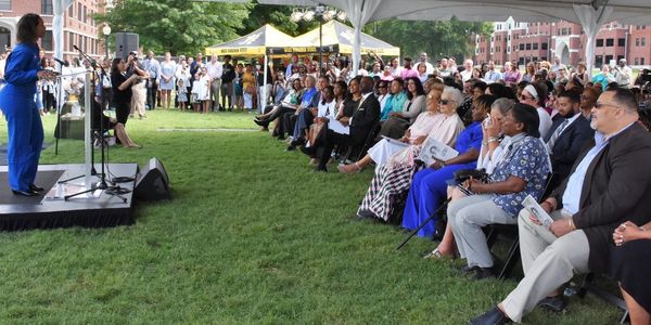 Astronaut Dr. Yvonne Cagle speaks to a large audience at the ceremony and the unveiling of the Dr. Katherine Coleman Goble Johnson's Statue and Scholarship Fund Ceremony.