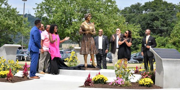 Rev. Frederick Hightower, who is shown in the blue suit, created this beautiful bronze colored life size statue of Dr. Katherine Coleman Goble Johnson surrounded by her family at West Virginia State University.