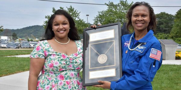 Senaia "SiSi" Harris and Astronaut Yvonne Cagle hold up a reward given to her during the Dr. Katherine Coleman Goble Johnson Statue unveiling and Scholarship Fund Ceremony at West Virginia State University.